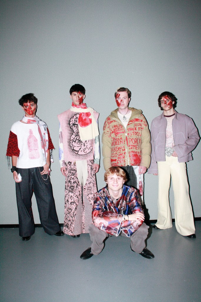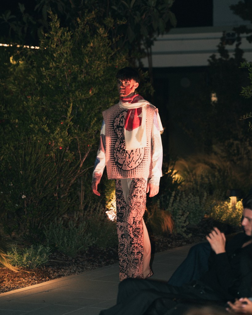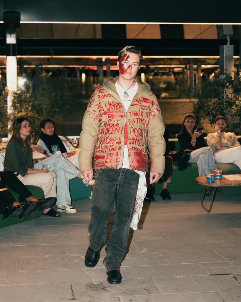 As part of the Pitti uomo festival week the ‘Glorification of Non-sense’ graduate collection of Jacopo Koning was selected in the event tailored by the FSR organisation. Here under is the documentation of the event that features the hand sewn clothing with screen printed and digitally printed details, and handmade accessories such as the pewter ‘face’ belt.