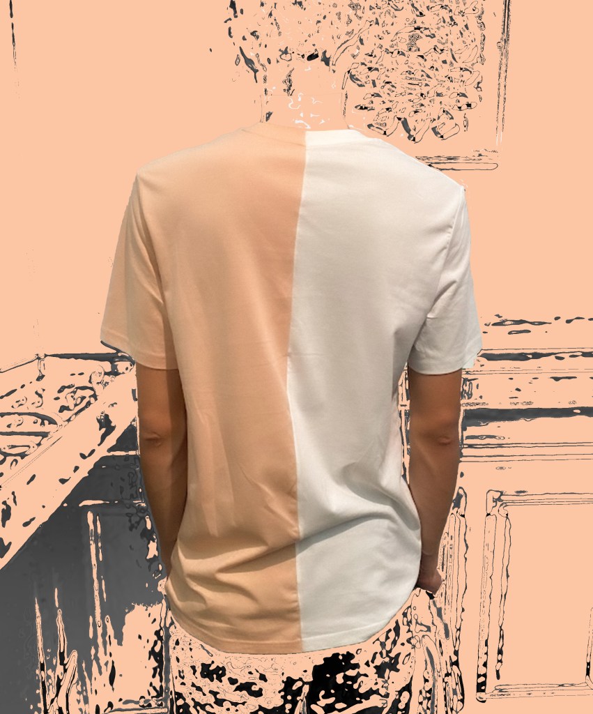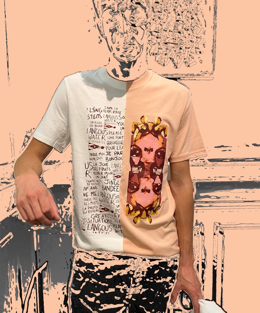 A t-shirt with two different prints and colours, the two initial garments were cut in half and sewn together. One print represents a metamorphosis of the face, which started with a screenshot of a video call between the artist and his father. The other print was a selection of sentences in French and English that glorify non-sense.